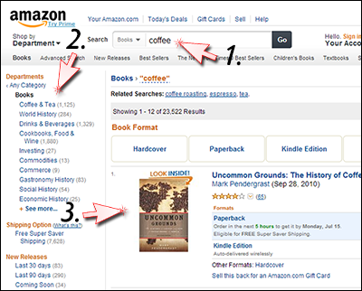 For this example, I searched for “coffee” (1). In the left navigational column (2) Amazon breaks down all of the coffee book categories. In the center of the webpage is the information about the product (3).
